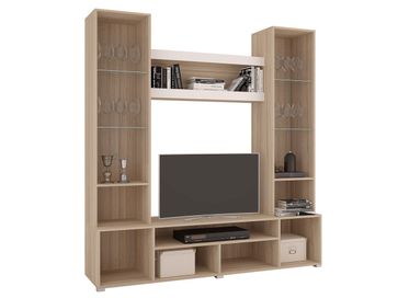 Гостиная Анталия — прекрасный вариант для размещения телевизора и аксессуаров. Центральным элементом модели является ТВ-тумба с полками, на которых удобно хранить электронику, книги и другие необходимые вещи. По бокам расположены два отделения со стеклянными полочками для посуды или элементов декора.<br>