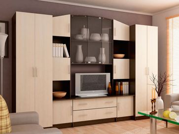 Характеристики: <br> Материал: ЛДСП, кромка ПВХ, прозрачное стекло.<br> Материал ручек и опор: пластик.<br> Механизм открывания: распашной.<br> Тип направляющих: роликовые.<br> Тип штанги: евроштанга.<br> Размер ниши для ТВ: 868 х 672 мм.<br> Ориентация сборки: только так, как показано на изображении.<br> None Страна производства: Россия