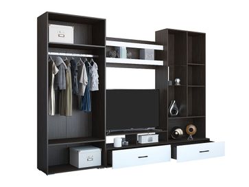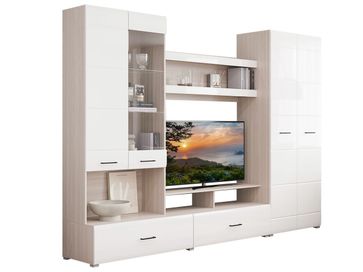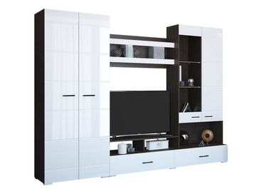 Модная современная гостиная Ненси с глянцевыми фасадами имеет в своем составе вместительный распашной шкаф со штангой для плечиков, центральную секцию с нишей для ТВ и мультимедиа системы, а также шкаф-витрину с закрытой секцией и полками. В основании расположены два выдвижных ящика.<br>