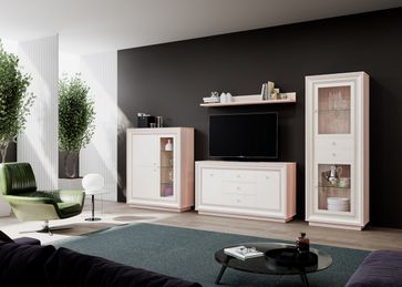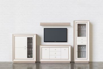 Гостиная Прато — стильный и практичный вариант для оформления идеальной общей комнаты. Нежная цветовая гамма исполнения позволит создать максимально уютную атмосферу.<br> Для изготовления моделей используется высококачественная ЛДСП. Петли на дверях имеют доводчики.<br> В комплект входят (ВхШхГ):<br> <br> ТВ-тумба с ящиками: 861 х 1556 х 426 мм.<br> Малый шкаф-витрина: 1425 х 1179 х 426 мм.<br> Большой шкаф-витрина: 2100 х 776 х 426 мм.<br> Настенная полка: 146 х 1556 х 252 мм.<br>