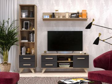 В комплект входят (ВхШхГ): <br> ТВ-тумба: 536 х 1350 х 404 мм.<br> Настенная полка: 250 х 1350 х 216 мм.<br> Стеллаж: 1940 х 450 х 404 мм.<br>