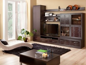 <br> Характеристики: <br> Материал корпуса: ЛДСП.<br> Материал фасада: ЛДСП, МДФ, стекло.<br> Материал декоративных вставок: экокожа.<br> Размер ниши для ТВ: 1200 х 549 мм.<br> Шкафы и витрины модульной серии универсальны по сборке, двери могут открываться как на правую, так и на левую сторону.<br>