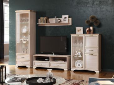 <br> В состав комплекта входят (ВхШхГ):<br> Шкаф-витрина: 2130 х 656 х 399 мм;<br> ТВ-тумба: 513 х 1304 х 383 мм;<br> Полка навесная: 267 х 1300 х 216 мм;<br> Шкаф-витрина низкий: 1261 х 944 х 383 мм.<br>