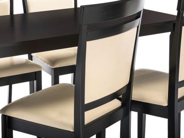 Обеденная группа Модис — практичное решение для меблировки кухни, столовой или гостиной в любом стиле. Контрастное сочетание светлой обивки и темного дерева придает помещению яркости и динамичности. Комплект не занимает много места благодаря компактным габаритам стола и стульям без подлокотников.<br>