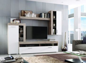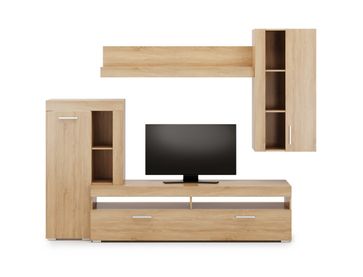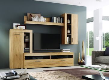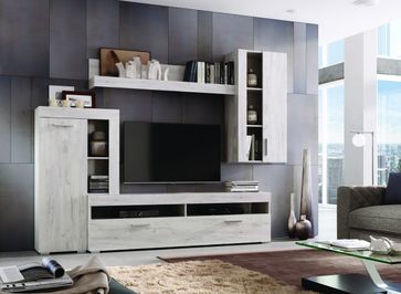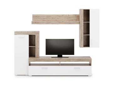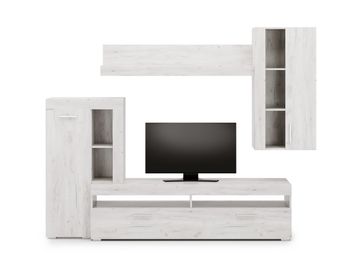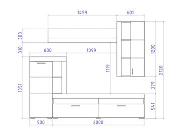 В комплект входят (ВхШхГ):<br> настенная полка: 1499 х 300 х 268 мм;<br> навесной шкаф: 1200 х 601 х 440 мм;<br> напольный шкаф: 1351 х 800 х 440 мм;<br> ТВ-тумба: 514 х 2000 х 440 мм.<br> <br>