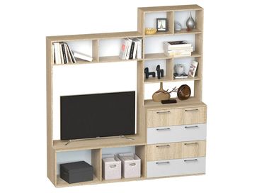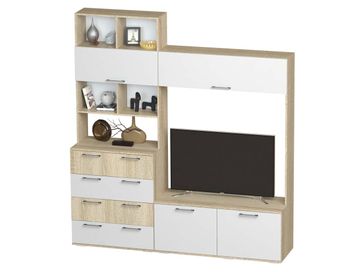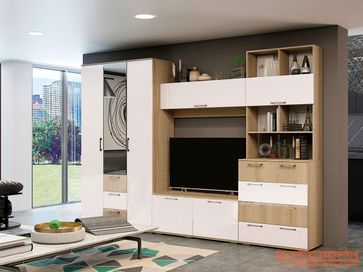 Преимущества: <br> функциональное наполнение — система хранения гостиной поможет аккуратно разложить множество вещей;<br> место под ТВ — во вместительную нишу с легкостью поместится телевизор до 50 дюймов;<br> современный дизайн — органичное сочетание светлого дерева и белого глянца будет уместно в большинстве интерьеров.<br>