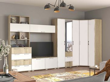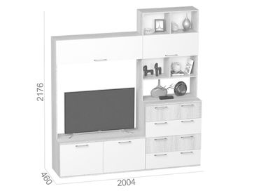 В состав комплекта входят (ВхШхГ): <br> Шкаф-пенал: 2176 х 402 х 460 мм.<br> Стенка для гостиной: 2176 х 2004 х 460 мм.<br> Шкаф угловой: 2176 х 751 х 751 мм.<br> Шкаф трехстворчатый: 2176 х 1202 х 460 мм.<br>