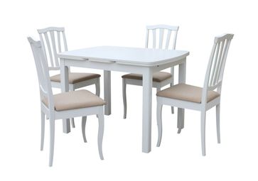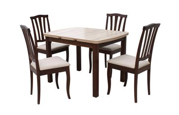 Каркас стульев, подстолье и ножки стола изготавливаются из массива бука. Столешница сделана из ЛДСП 16 мм с покрытием полимерной влаго- и износостойкой пленкой. Обивка на сиденье стульев — светлая ткань. None Страна производства: Россия