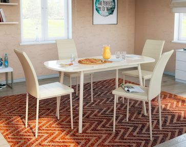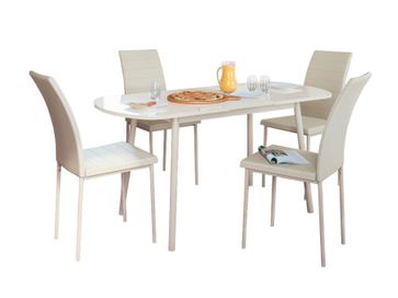 Обеденная группа Раунд Винс идеально подойдёт для оформления столовой, кухни или гостиной комнаты.<br> Комплект состоит из прямоугольного стола и четырех стульев.<br> Для изготовления элементов данного набора использованы такие материалы, как ЛДСП, стекло, металл и экокожа.<br> Габариты стола (ВхШхГ) — 75 х 120/150 х 70 см.<br> Габариты стула (ВхШхГ) — 95 х 41 х 57 см.<br> В качестве мягкого наполнителя спинки и сиденья использован пенополиуретан, толщина слоя составляет 3 см.<br> Благодаря современному методу обработки высокой температурой, стеклянная столешница является прочным и безопасным элементом изделия, а металлические ножки обеспечат устойчивость.<br> Набор представлен в нежном кремовом цвете, такое решение позволит сочетать комплект с практически любым интерьером. None Страна производства: Россия