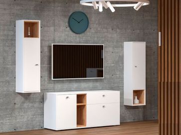 В состав комплекта входят (ВхШхГ): <br> Навесной шкаф, 2 шт.: 1204 х 320 х 270 мм.<br> ТВ-тумба: 622 х 1314 х 430 мм.<br>