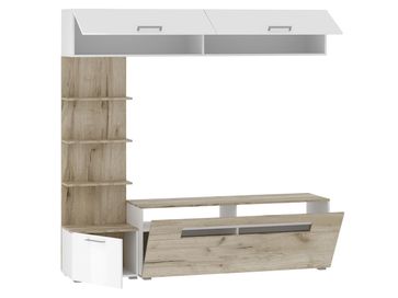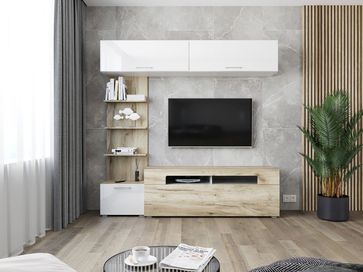 Миниатюрная гостиная Сидней отлично впишется в любое помещение. Сочетание белых глянцевых фасадов и светлого дерева порадует любителей минимализма в интерьере. Модель оснащена широкой ТВ-тумбой и множеством ниш для удобного хранения вещей.<br>