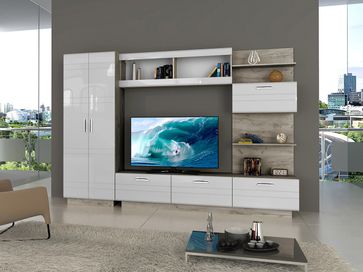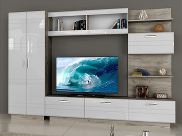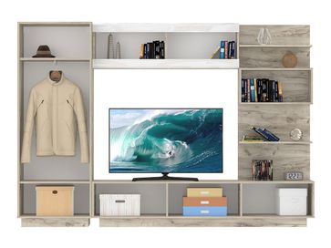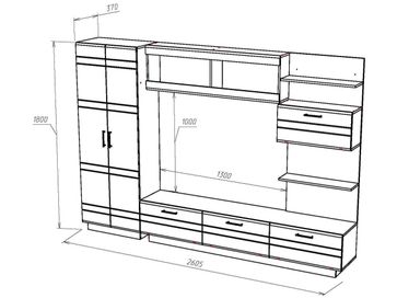 В состав комплекта входят (ВхШхГ): <br> ТВ-тумба: 400 х 1952 х 370 мм;<br> Стеллаж: 1400 х 652 х 240 мм;<br> Навесная полка: 400 х 1300 х 220 мм;<br> Распашной шкаф: 1800 х 652 х 370 мм.<br>