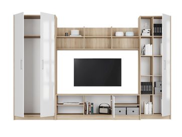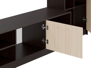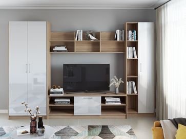 Большая функциональная гостиная Балфур позволит вам практично организовать пространство в комнате, ведь в составе стенки есть два шкафа для одежды, множество полочек и отделений для вещей и аксессуаров, и конечно же широкая ниша для установки телевизора и мультимедиа оборудования.<br>