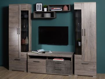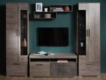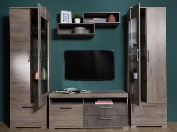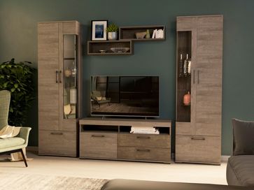 В состав комплекта входят (ВхШхГ): <br> Шкаф-витрина, 2 шт.: 2020 х 600 х 377 мм.<br> Полка-ниша, 2 шт.: 195 х 650 х 270 мм.<br> ТВ-тумба: 576 х 1300 х 450 мм.<br>