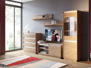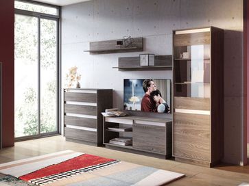 В комплект входят (ВхШхГ): <br> Шкаф-витрина: 1784 х 588 х 400 мм.<br> ТВ-тумба: 554 х 1242 х 400 мм.<br> Настенная полка, 2 шт: 240 х 1424 х 176 мм.<br> Комод: 994 х 888 х 400 мм.<br>