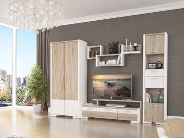 В состав комплекта входят (ВхШхГ): <br> Шкаф распашной: 2035 х 870 х 540 мм.<br> ТВ-тумба: 505 х 1470 х 450 мм.<br> Небольшая надстройка: 228 х 440 х 216 мм.<br> Большая надстройка: 555 х 925 х 245 мм.<br> Стеллаж: 2035 х 470 х 355 мм.<br> <br>