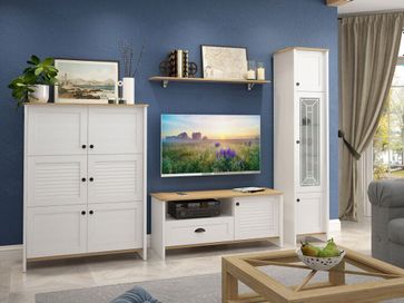 Современная модульная гостиная Тифани станет оптимальным решением для оформления интерьера. Компактная и одновременно функциональная композиция позволит рационально разместить личные вещи, книги, мультимедиа и предметы декора. <br> Состав комплекта (ВхШхГ): <br> Шкаф-витрина: 1995 х 450 х 480 мм.<br> Комод: 1390 х 1060 х 480 мм.<br> ТВ-тумба: 545 х 1260 х 480 мм.<br> Полка навесная: 16 х 1260 х 220 мм.<br>