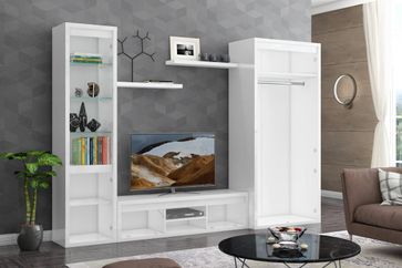Гостиная Норд поможет создать современную и уютную атмосферу в комнате. Белые глянцевые поверхности в сочетании со стеклянными элементами сделают интерьер строгим и изящным.<br> В состав комплекта входят (ВхШхГ):<br> Шкаф-витрина: 2020 х 495 х 400 мм.<br> Распашной шкаф: 2020 х 910 х 505 мм.<br> ТВ-тумба: 395 х 1490 х 400 мм.<br> Настенная полка, 2 шт.: 40 х 800 х 190 мм.<br>