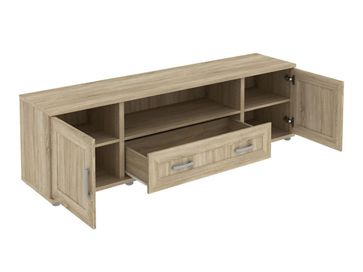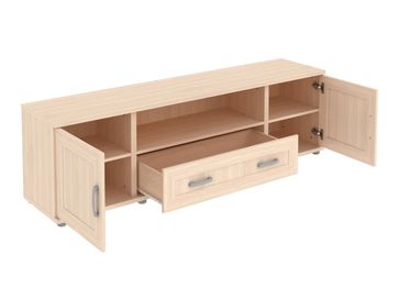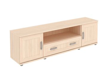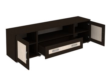 Характеристики: <br> Материал корпусов: ЛДСП 16 и 22 мм.<br> Материал фасадов: рама МДФ, вставка стекло 4 мм, вставка ЛДСП 10 мм.<br> Материал задней стенки: облагороженный ДВП белого цвета.<br> Материал ручек и опор: пластик.<br> Тип направляющих: роликовые.<br> Максимальная нагрузка на ящик: 5 кг.<br> Максимальная нагрузка на полку: 25 кг.<br> Размер ниши для ТВ (ВхШ): 850 х 1350 мм.<br> Фрезеровка под петли на створках производится на одну сторону.<br>
