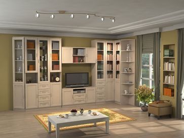 В состав комплекта входят (ВхШхГ): <br> Шкаф-витрина торцевой: 2216 x 300 x 113/370 мм.<br> Широкий шкаф-витрина: 2216 x 1126 x 370 мм.<br> Узкий шкаф-витрина: 2216 x 375 x 370 мм.<br> Угловой шкаф-витрина: 2216 x 735 x 735/370 мм.<br> Настенная полка: 522 x 1201 x 370 мм.<br> ТВ-тумба: 596 x 1201 x 370 мм.<br> Стеллаж угловой: 2216 x 370 x 370 мм.<br> <br>