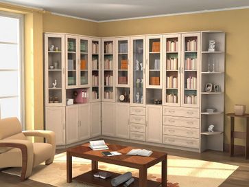 В состав входят (ВхШхГ): <br> Шкаф-витрина торцевой: 2216 x 300 x 113/370 мм.<br> Шкаф-витрина с нишей: 2216 x 750 x 370 мм.<br> Шкаф-витрина угловой: 2216 x 735 x 735 мм.<br> Шкаф-витрина комбинированный: 2216 x 1126 x 370 мм. Шкаф-витрина с ящиками: 2216 x 750 x 370 мм.<br><br> Стеллаж угловой: 2216 x 330 x 370 мм.<br> <br>