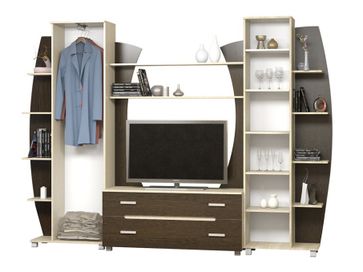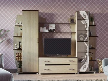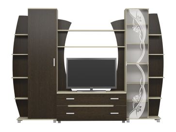 Оригинальная гостиная Тиана станет стильным и практичным элементом в интерьере. Округлые линии в сочетании с изящным рисунком придают модели особый шарм и создают уютную атмосферу, идеальную для отдыха в кругу семьи.<br> Преимущества:<br> <br> вместительная — найдется место для любых мелочей: от мультимедиа до одежды;<br> функциональная — ТВ-тумба, шкаф для одежды, шкаф-витрина и множество открытых и закрытых полок;<br> изящный дизайн — плавные линии, элегантный цветочный рисунок на стеклянных дверцах.<br><br> Данная стенка — прекрасный вариант для оформления гостиной. Декоративные элементы на полочках гармонично дополнят ее внешний вид и украсят интерьер комнаты.<br>Разнообразие отделений поможет создать превосходную систему хранения. ТВ-тумба разместит аудио- и видеотехнику, витрина и полочки подойдут для хранения посуды и сувениров, а закрытое отделение с евроштангой идеально для вешалок с одеждой.<br> Размер ниши под ТВ (ВхШ): 780 х 1200 мм.<br> Модель изготовлена из ЛДСП толщиной 16 мм, витрина дополнена гнутым прозрачным стеклом с пескоструйным рисунком. None Страна производства: Россия