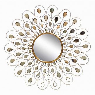 Зеркало настенное 19-OA-5838. Зеркало в интерьере является не только функциональным предметом. С помощью дизайнерской фантазии появляются широкие возможности использования зеркал для современного декора. Если вы захотите купить настенное зеркало, которое станет интересным акцентом в интерьере, обратите внимание на этот декоративный вариант. Лучи, расходящиеся от центрального элемента, выполнены в виде стилизованных павлиньих перьев, и центр каждого из них также декорирован маленьким зеркалом. Этот вариант прекрасно подойдет для настенного декора любого помещения. И помните, что купить круглое зеркало – по фен-шуй означает принести в дом счастье. А павлиньи перья притягивают удачу и успех в делах.Центральное зеркало диаметром - 280 мм. Работаем круглосуточно!Возврат 21 день. Страна производства: Россия Есть доставка.