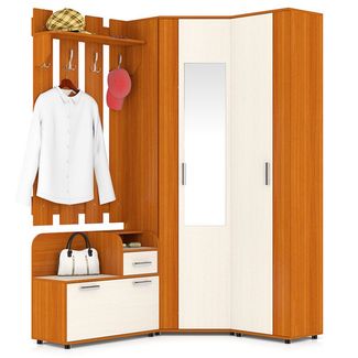 Пэ Пять Компоновка № 5. Цвет - вишня/дуб. Размер (УГОЛхГхВ) 150х120(угол)х36х216 см. Красивая угловая прихожая, составленная из навесной вешалки, тумбы для обуви и двух шкафов - классический подход к комфорту и уюту в любимом доме! Универсальная сборка. None Есть доставка.