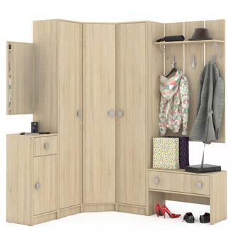 Глория 2 Прихожая 01. Артикулы элементов прихожей 127+120 + 109+107+109 + 128/02+123. Цвет - дуб сонома. Размер (УголхГхВ) 160х141(угол)х36х207 см. Вместительный угловой гарнитур из высокой тумбы с зеркалом, углового шкафа и двух одностворчатых, открытой вешалки с низкой тумбой - идеальная обстановка для Вашей комфортной прихожей. Универсальная сборка. None Есть доставка.