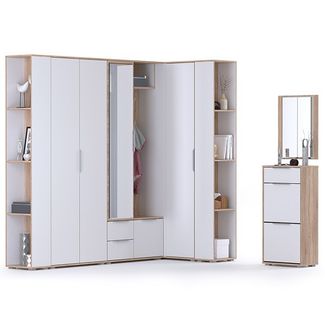 Мебель в прихожую серии Куба № 15. Цвет - дуб сонома/белый премиум. Размер (ШхГхВ) ШхГхВ 230,1х107,3х210,6 см. + 50х28,3х180 см. Комплектация - шкаф комбинированный, шкаф угловой, двустворчатый, распашной шкаф для одежды, два стеллажа, обувница высокой с ящиком и зеркало. Уют и дизайнерский вкус. Универсальная сборка. None Есть доставка.