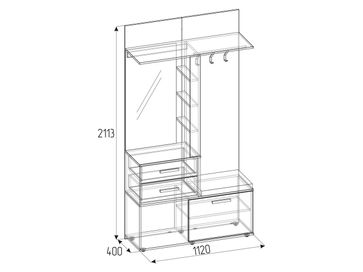 В комплект входят (ВхШхГ): <br> Обувница: 879 х 782 х 405 мм.<br> Распашной шкаф: 2113 х 560 х 400 мм.<br> Шкаф для обуви: 2113 х 300 х 400 мм.<br> Прихожая: 2113 х 1120 х 400 мм.<br> Настенное зеркало: 784 х 816 х 32 мм.<br>