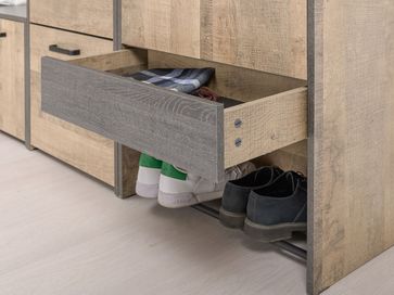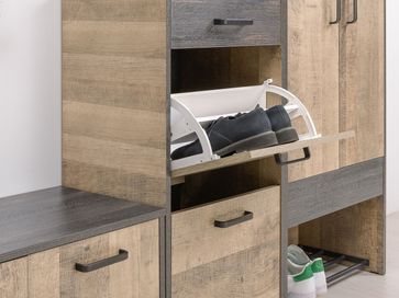 Прихожая Трувор выполнена в трендовом стиле лофт. Контрастные металлические элементы и лицевая фурнитура придают мебели индустриальную эстетику. Петли и направляющие оснащены доводчиками, что делает эксплуатацию особенно комфортной: дверцы и ящики двигаются плавно и бесшумно. Удачная комбинация элементов позволяет организовать удобную систему хранения, где для каждой вещи найдется свое место.<br>