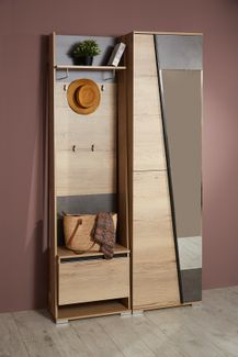 Компактная модульная прихожая Стреза — это отличный вариант для организации удобного и красивого места в вашем коридоре. Отличительной особенностью данной прихожей является нестандартные формы в сочетании с популярными направлениями в дизайне — эко и лофт.<br> Преимущества:<br> малая глубина — не смотрится громоздко, подходит для узких помещений;<br> оригинальный дизайн — интересная геометрия форм, которая привлекает внимание;<br> зеркало на дверце шкафа — можно видеть себя в полный рост, визуально увеличит пространство;<br> открытая вешалка — вся необходимая верхняя одежда всегда под рукой;<br> открытые верхние полки — удобное хранение головных уборов или красивых аксессуаров;<br> закрытый ящик — можно разместить небольшие предметы.<br>