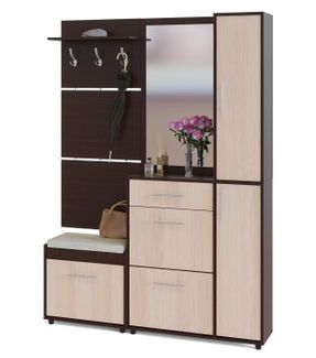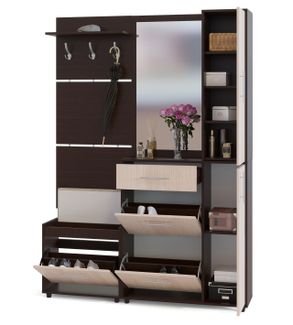 Для одежды в этом гарнитуре предусмотрена открытая вешалка с крючками и полкой. Для обуви есть две обувницы: малая в виде банкетки с мягким откидным сиденьем (под ним есть ниша); рассчитана на четыре пары обуви;<br> большая с двумя отсеками, выдвижным ящиком и узким шкафом справа (не универсальна).<br>