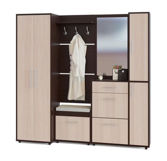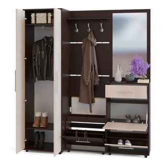 Распашной шкаф оснащен выдвижной штангой и двумя полками: сверху и снизу. Зеркальная панель дополнена шкафчиком сбоку, который во время сборки можно расположить как справа, так и слева. Открытая настенная вешалка имеет ряд крючков и полку для головных уборов.<br>