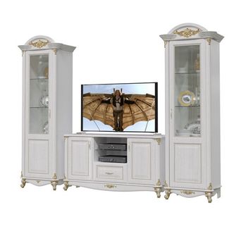 Да Винчи белая Гостиная 04. Артикулы элементов набора - ГД-01 + ГД-03 + ГД-02. Цвет - патина белый. Размер (ШхГхВ) 269х52х230 см. Элитная стеночка для роскошной гостиной состоит из тумбы ТВ и двух однодверных шкафов, левого и правого. Очаровательный ансамбль с классической симметрией расположения шкафов украсит интерьер, выразительно и практично. None Есть доставка.