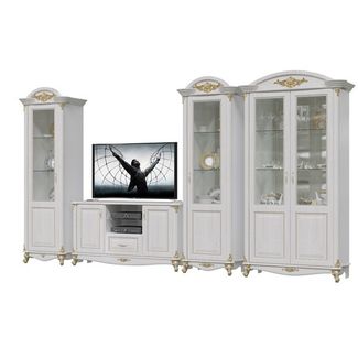 Да Винчи белая Гостиная 11. Артикулы элементов набора - ГД-01 + ГД-03 + ГД-02 + ГД-04. Цвет - патина белый. Презентабельный гарнитур, состоящий из стеночки из тумбы ТВ и двух 1-дверных шкафов левого и правого, и шкафа, 2-х дверного - основа изысканного уюта Вашего дома. None Есть доставка.