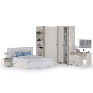 Гарнитур спальный Амели Моби № 2. Цвет - шёлковый камень/бетон чикаго беж/искусственная кожа белая. Комплектация - кровать 1600, прикроватная тумбочка, туалетный столик с зеркалом и комодом, и четыре максимально высоких шкафа - двустворчатый, угловой, стеллаж, пенал. Спальное место 1600х2000 мм. Подъёмное ортопедическое основание в комплекте, матрас приобретается отдельно. None Есть доставка.
