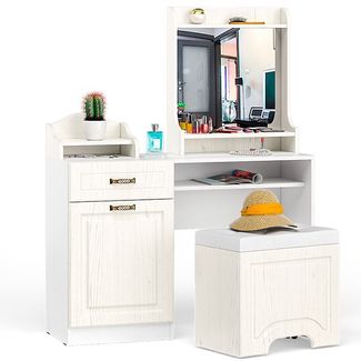 Стол туалетный с пуфом, с зеркалом и настольной полкой Ливерпуль. Артикулы элементов набора мебели 00.118 +00.02. Цвет - ясень ваниль/белый. Прелестный дамский уголок, где работа «над собой» превращается в отдых! None Есть доставка.