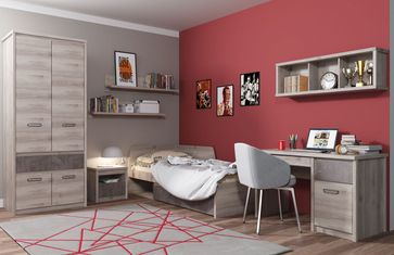 В комплект входят (ВхШхГ): <br> Тахта: 925 х 1670 х 2080 мм.<br> Прикроватная тумба: 925 х 500 х 338 мм.<br> Шкаф распашной: 2100 х 1002 х 581 мм.<br> Стол письменный: 917 х 802 х 356 мм.<br> Навесной шкаф открытый: 616 х 636 х 34 мм.<br> Полка навесная, 2 шт.: 616 х 636 х 34 мм.<br><br>