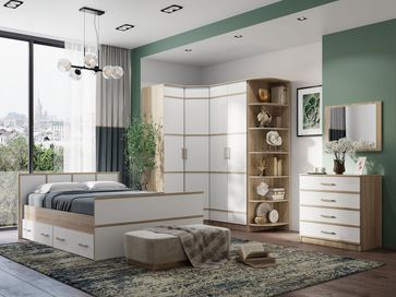 В комплект входят (ВхШхГ): <br> Кровать без подъемного механизма: 860 х 1550 х 2034 мм.<br> Распашной шкаф: 2220 х 800 х 610 мм.<br> Распашной шкаф: 2220 х 400 х 610 мм.<br> Распашной шкаф: 2220 х 880 х 880 мм.<br> Комод: 870 х 850 х 500 мм.<br> Стеллаж: 2220 х 330 х 610 мм.<br> Настенное зеркало: 600 х 800 х 15 мм.<br>