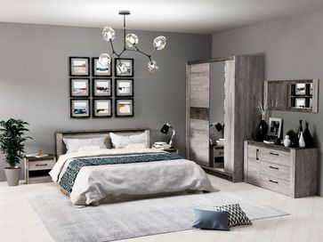 В комплект входят (ВхШхГ): <br> Кровать: 860 х 1668 х 2077 мм.<br> Прикроватная тумба, 2 шт.: 450 х 500 х 381 мм.<br> Шкаф-купе: 2200 х 1778 х 631 мм.<br> Комод: 750 х 1300 х 435 мм.<br> Настенное зеркало: 500 х 1290 х 22 мм.<br>