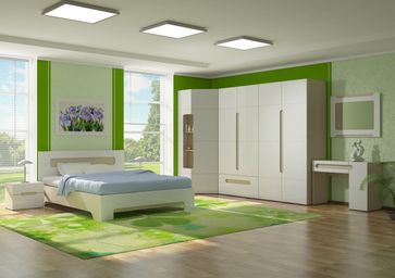В комплект входят (ВхШхГ): <br> Кровать: 900 х 1660 х 2060 мм.<br> Прикроватная тумба, 2 шт.: 410 х 500 х 350 мм.<br> Угловой шкаф: 2110 х 930 х 930 мм.<br> Распашной шкаф: 2110 х 1070 х 560 мм.<br> Двустворчатый шкаф: 2110 х 1070 х 560 мм.<br> Туалетный столик: 750 х 1000 х 450 мм.<br> Настенное зеркало: 700 х 900 х 10 мм.<br> <br>