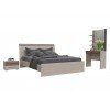Модульный спальный гарнитур Азалия композиция №2 состоящая из четырех элементов. Удобная кровать с высоким изогнутым изголовьем, две прикроватные тумбочки с двумя выдвижными ящиками. Косметический столик с зеркалом, открытыми полками и ящичками. Фасад мебели ЛДСП со вставками МДФ, который украшен декоративной фрезеровкой в виде волнистых линий.