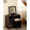 Креативный туалетный столик для косметики являет собой гармоничное сочетание эстетики и функциональности. Часть столешницы с легкостью откидывается, с ее внутренней стороны находится зеркало и вместительный ящик для косметики и аксессуаров. Под столешницей находится небольшая открытая ниша и глухой шкафчик с двумя секциями.