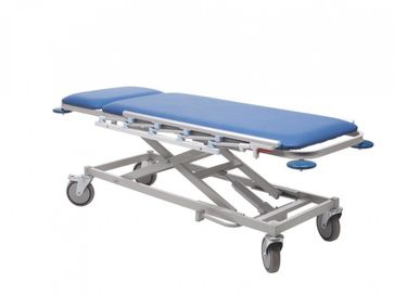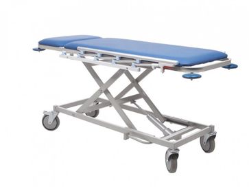 каркас - стальные трубы прямоугольного сечения 50252 мм каркас покрыт экологически чистой эпоксидной полимерно-порошковой краской, устойчивой к регулярной обработке всеми видами медицинских дезинфицирующих и моющих растворов лежак тележки двухсекционный, состоит из ложа и подголовника головная секция ложа регулируется по углу наклона ступенчатым механизмом "Rostomat" от 0° до 45° по боковым сторонам каркаса тележки установлены пластмассовые роликовые бамперы, ∅ 100 мм колеса поворотные, самоориентирующиеся, ∅ 200 мм, из немаркой серой резины, не оставляющего следов на полу, два колеса – с индивидуальным тормозным устройством два боковых складывающихся ограждения регулировка высоты осуществляется с помощью гидропривода. Диапазон регулировки 490 до 990 мм мягкий лежак тележки двухсекционный, состоит из ложа и подголовника. Изготовлен из ДСП толщиной 16 мм и поролона толщиной 40 мм, плотность 20 кг/м3 обивка: искусственная кожа, полумягкая синего цвета, устойчивая к истиранию и воздействию дезинфицирующих средств номинальная нагрузка до 170 кг поставляется в разобранном виде цвет: каркас- серый (RAL - 7038), ложе- синий тип покрытия: полимерно-порошковое None
