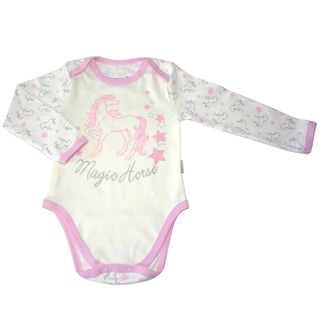 Очаровательное боди для девочки. Украшено аккуратными лошадками и розовыми звездочками. Хорошо впитывает влагу, не вызывает аллергии. None