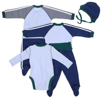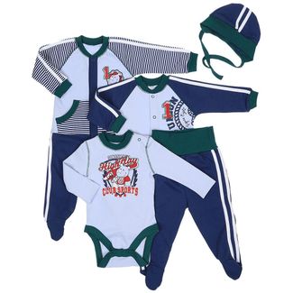 Комплект для мальчика состоит из 5 предметов: чепчик, кофточка, комбинезон, боди, ползунки. Создан из интерлока, качественного трикотажа, экологически чистого и абсолютно безвредного для малышей. None