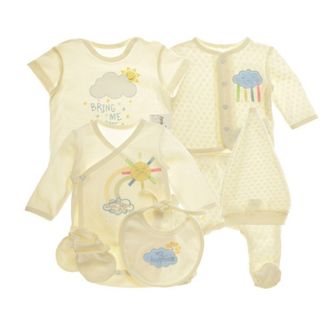 Комплект состоит из 7 предметов одежды, необходимой каждому малышу. Кофточка, футболка, ползунки, пинетки, шапочка, слюнявчик и боди понравятся своим приятным дизайном и универсальностью. Надевайте кофточку и ползунки, захватите с собой остроконечную шапочку и смело отправляйтесь на прогулку или в гости. Одежда изготовлена из прочного мягкого материала. Интерлок отлично держит форму, не растягивается. Он отлично согревает в прохладное время и не раздражает нежную кожу ребенка. В таком наряде ребенок будет выглядеть очень стильно. Внимание! Фактический цвет изделия может незначительно отличаться от цвета на фотографии в связи с особенностями цветопередачи различных цифровых устройств. None