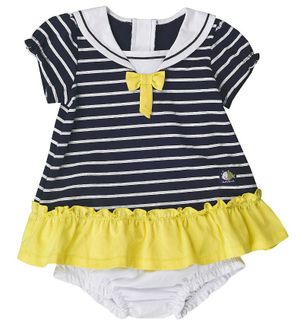 Комплект для девочки Crockid в полоску выполнен в сочетании белого и темно-синего цветов, застегивается на кнопки сзади, украшен декоративным бантиком. Минимальная сумма заказа 1500 руб. Возможен самовывоз. Есть доставка.